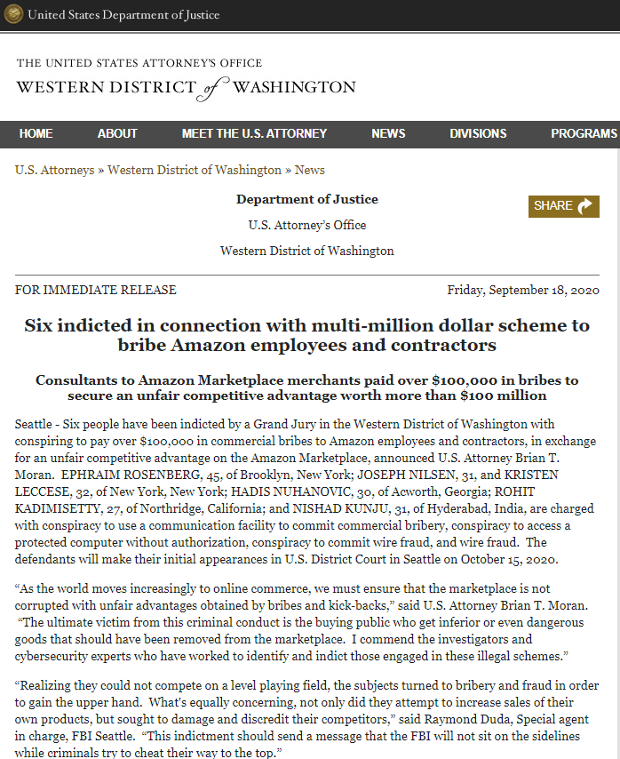 相信不少亚马逊卖家都曾听说过类似“亚马逊内部渠道”的说法,它们出自服务商口中,内部强开账号、内部恢复链接、内部突破发货限制,种种操作仿佛宣告了服务商的“无所不能”。 而正是这些所谓的“内部渠道”,让不少卖家都被割了韭菜。 关于种种“内部渠道”,有人趋之若鹜,也有人置若罔闻,而近日的一则新闻,却证实了这种说法的真实性,内部强开的手段竟然真实存在?下面请跟随小编一起了解一则关于亚马逊的惊天新闻。 据外媒报道,美国司法部于当地时间上周五指控六人参与贿赂亚马逊员工和承包商的计划,以在该公司的在线市场获得“不公平的优势”。 联邦检察官指控,自2017年以来,这些人利用贿赂和欺诈手段,为在亚马逊市场上销售商品的第三方商家谋取利益。 起诉书中描述说,这些人进行了复杂却协调一致的工作,据称是为了贿赂亚马逊员工以获取有关第三方卖家竞争对手的宝贵数据,以及访问有关亚马逊内部算法信息的特权。他们还通过贿赂亚马逊员工,以获取违反亚马逊自身规则的福利,例如销售限制类产品。 据称,这些人充当了第三方卖家的顾问,这些卖家出售了一系列商品,包括家居用品,消费电子产品和膳食补充剂。其中一些人不仅担任顾问,还以第三方卖家的身份在亚马逊上出售产品。 美国司法部表示,这些个人为第三方卖家获得了不公平的竞争利益,总价值超过1亿美元。这六个人分别被控使用通讯工具进行商业贿赂、串谋未经授权访问受保护的计算机、串谋进行电信欺诈。 对于员工受贿一案,亚马逊表态:“亚马逊没有欺诈行为的容身之地。” 该公司补充说,它拥有检测卖家或雇员可疑行为的系统,以及调查和制止违禁活动的团队。 关于此次亚马逊内部丑闻,仿佛早有预兆。 此前就有服务商爆料,因卖家申诉时将体检列表和死因截图作为附件发送至亚马逊,所以有可能引发亚马逊内部自查和反腐。而现在这个新闻的爆出,也恰恰反映了亚马逊近日或在开展自查。 那么所谓的内部渠道到底是什么呢?亚马逊员工又是如何通过何种手段帮助第三方卖家占据市场优势的?综合外媒报道以及上述案件,可以总结出以下几点亚马逊员工内部违规操作。 “受贿”的员工和承包商帮助恢复了亚马逊市场上被暂停的第三方卖家账户和产品列表,包括因消费者安全投诉而被暂停的膳食补充剂、被确定为易燃的家用电子产品以及因违反知识产权而被标记的消费品。 根据起诉书,亚马逊员工手动恢复被暂停的账户和产品列表,并批准商家提交的 “毫无根据和欺诈性”的申诉,在某些情况下,这些申诉是由员工自己起草的。 这些员工还通过暂停第三方卖家的账户,以及分享有关其收入、客户供应商和广告活动的信息,“协助攻击 ”第三方卖家的竞争对手。所以有时卖家被莫名封号,也有可能是竞争对手通过“内部渠道”实现的恶意行为。 据美国司法部,他们还提供了有关亚马逊内部算法的信息,使顾问能够 “用虚构的负面产品评论淹没竞争对手的产品列表”。 司法部称,亚马逊员工提高了第三方卖家在亚马逊仓库中的存储限额,使他们能够提供受限类别的产品,并向卖家提供关于最成功的广告活动和盈利产品的“内部内容”。 或许这个操作对应的正是服务商口中的“突破发货限制”,但至于他们的内部渠道是否源自亚马逊员工就不得而知。 此前,就有亚马逊员工员工与第三方共享客户电子邮件地址和电话号码,并向卖家提供内部数据和其他机密信息以及删除差评的服务。 看完上述内容,不知卖家是否有种熟悉的感觉?上述操作手段是不是也曾在卖家的朋友圈里出现过呢? 小编随便翻了几个服务商的朋友圈,发现打上了”内部渠道“名号的服务种类繁多,有内部包过KYC的、内部渠道开通口罩白名单的、内部渠道翻新listing的... 虽然现在服务商口中的”内部渠道“五花八门,但是其真实性也无法验证。即使真有“内部渠道”,通过贿赂亚马逊工作人员来达到非法商业目的也是违法或违规的。 据了解,使用通信设施进行商业贿赂并访问受保护的计算机的行为最高可判处五年监禁,而进行电信欺诈行为最高判处20年监禁。所以当卖家遇到所谓的“内部渠道”时,一定要冷静,加以甄别,切勿蹚浑水! 其实,此次员工受贿的丑闻,已经不是第一次出现在亚马逊内部。早在2018年,就有新闻爆出亚马逊员工在中间人的协助下向商户提供内部数据和其他机密信息;今年1月,亚马逊承认其员工不正确地访问了客户数据。 最后,小编再次提醒卖家要合法合规经营,切勿触碰平台和法律雷区。在这个新闻爆出之后,相信亚马逊会加大反腐败力度,相关人员也将受到惩处,卖家要引以为戒,提高鉴别虚假及不良服务的能力,避免踩坑!